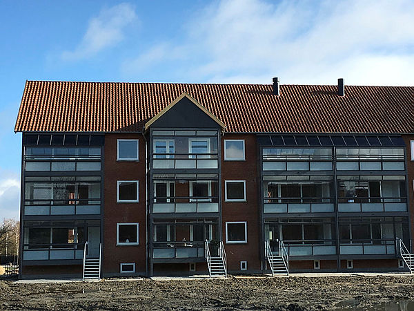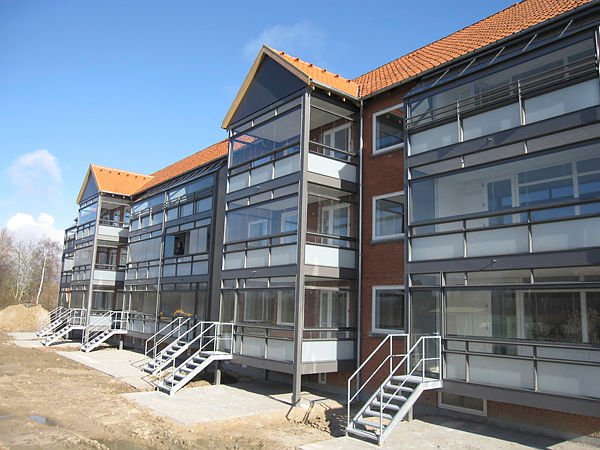 De ny-istandsatte opgange med ældre og handicapvenlige boliger er i god stand og fremstår lyse og meget indbydende. Alle rum er niveaufrie og der er elevator til alle lejligheder. Ligeledes har alle lejemål skønne udestuer/altaner der kan benyttes det meste af året, idet de er lukket med glas, der kan åbnes og lukkes. Endvidere har stuelejlighederne nedgang til egen lille have.